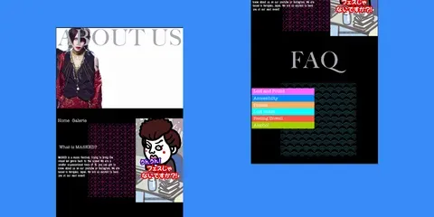 n einem Schulprojekt ware ich beauftragt, eine Webseite für ein Festival (Fiktiv oder Real) zu machen. Ich entschied mich dazu, für das japanische visual kei Festival "MASKED" eine Webseite zu machen. Ich liess mich dazu von den Plakaten inspirieren, die ich vom Festival fand und von visual kei (oder visual shock). Meine Interpretation von visual kei war, das es sehr vielfältig ist und ein eher chaotischer Auftritt ist. Darum hatte ich ein buntes Farbschema, grössere Typografie-Auswahl und ein wildes Raster. Ein überfordernder Anblick, und trotzdem findet man repetierende Elemente, um Struktur beizubehalten.